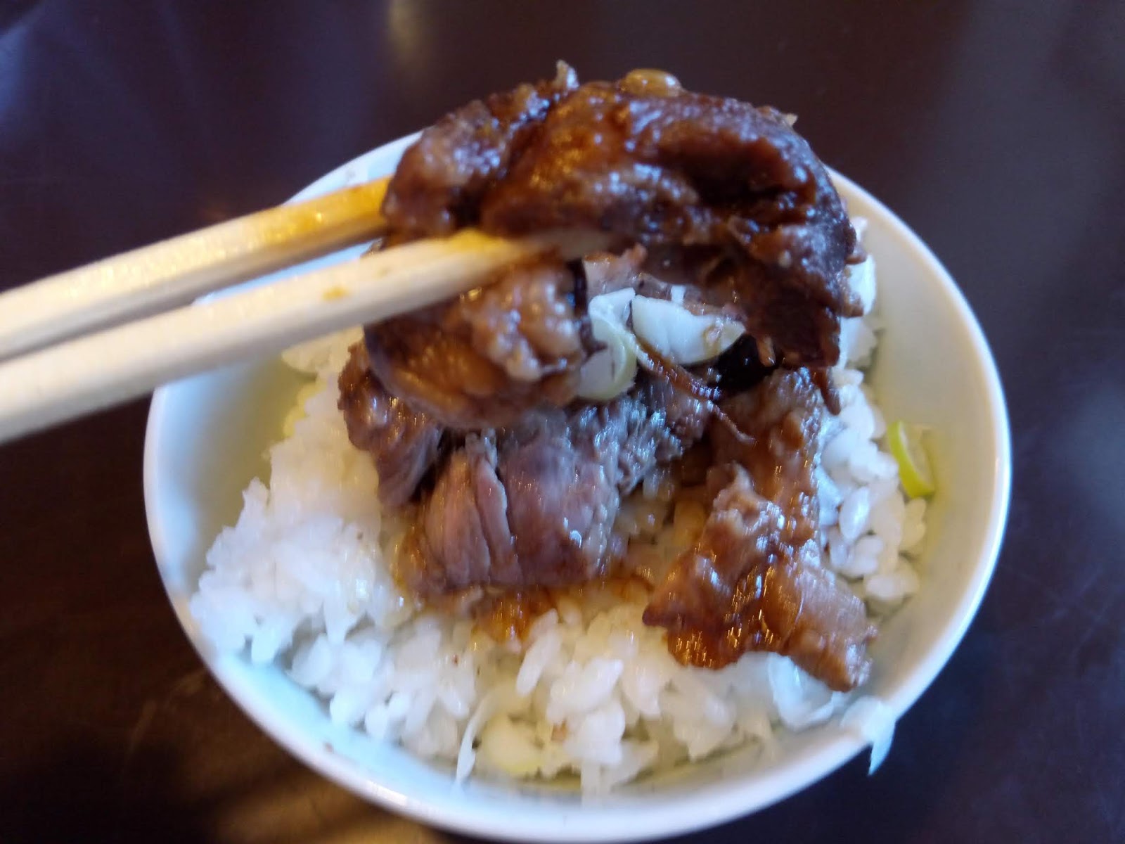 つけ汁にくぐらせていただくと、つけ汁の塩気に負け気味です半分くらい汁につけて頂くのが丁度よい感じかなりのボリュームですが、それでも、重くないつけ汁のおかげか、あっという間に完食です続いて肉丼