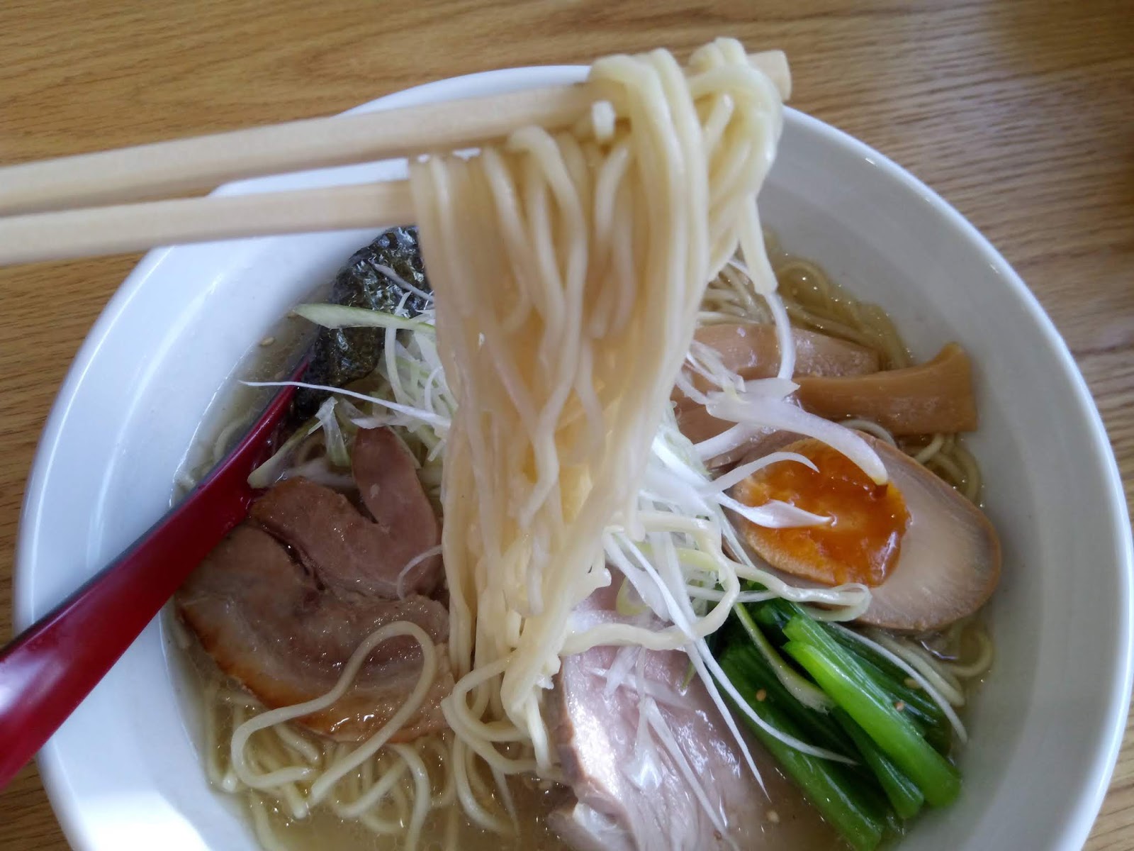 麺は、塩らーめんに合う細麺、少しパツパツとした食感です全体的にきれいにまとまっているラーメンといった印象
