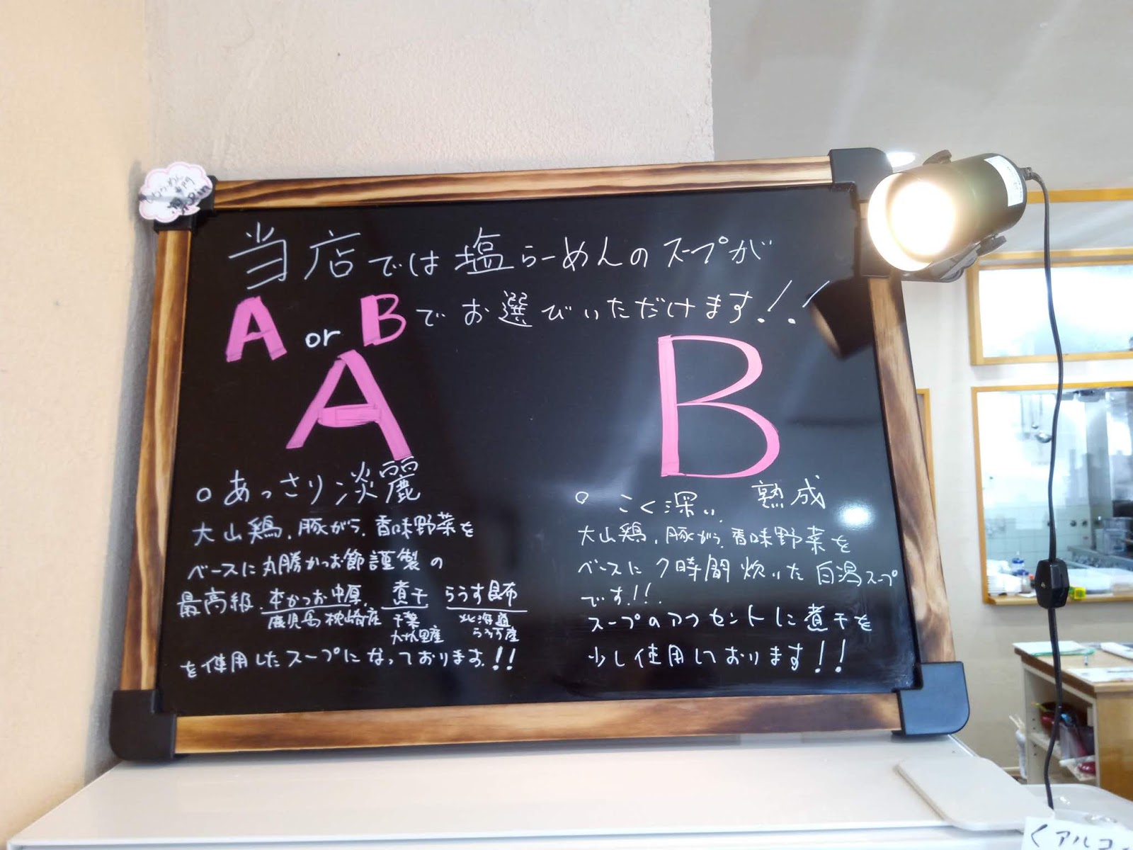 さらに、Aあっさり、Bこってりと2種類のスープを選べます今回は、塩らーめん(大盛)800円のB(こってり)を注文