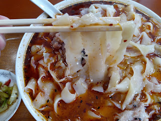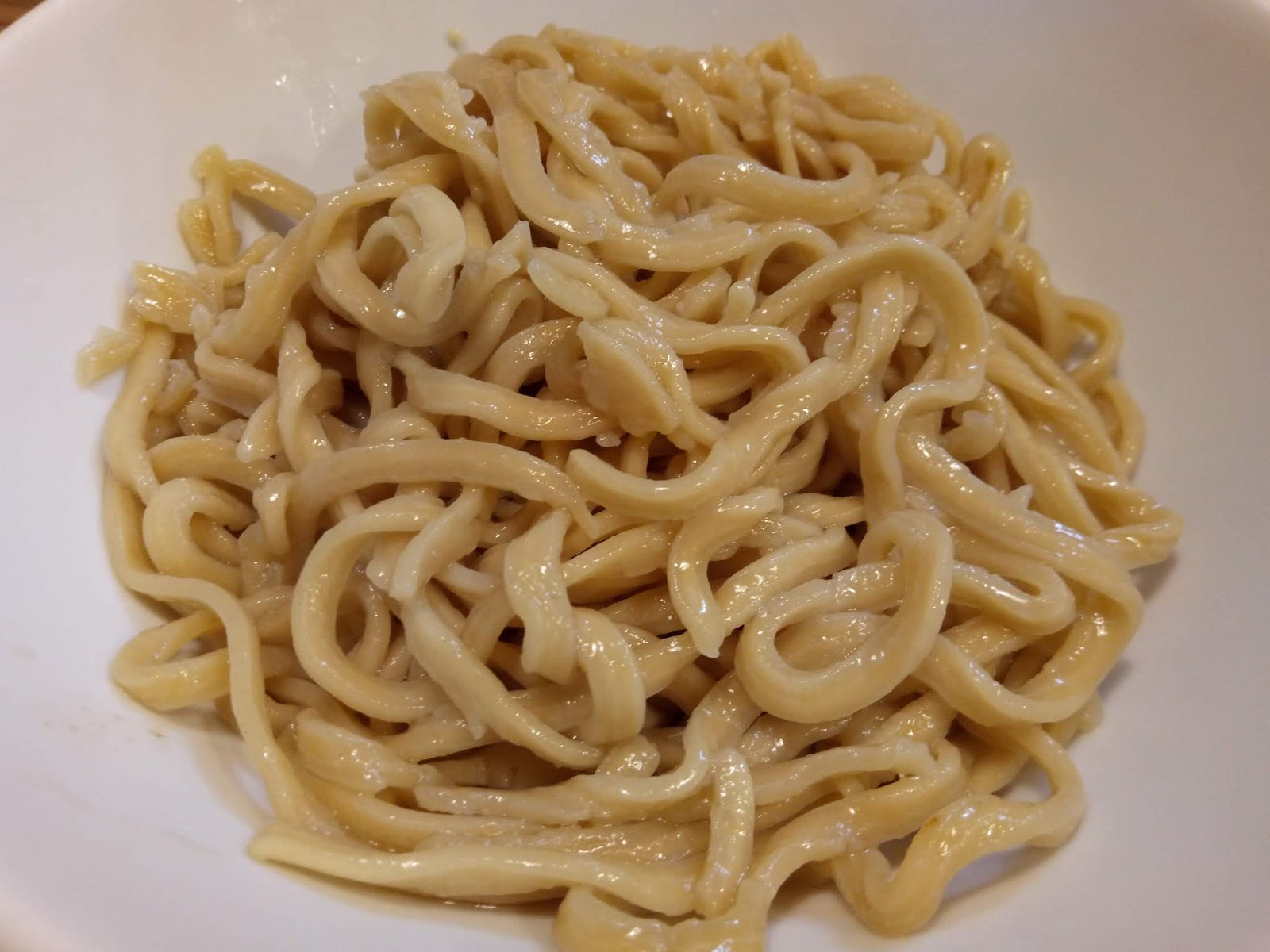 麺は、つやつやもちもちツルツルの中太やや平たいタイプ