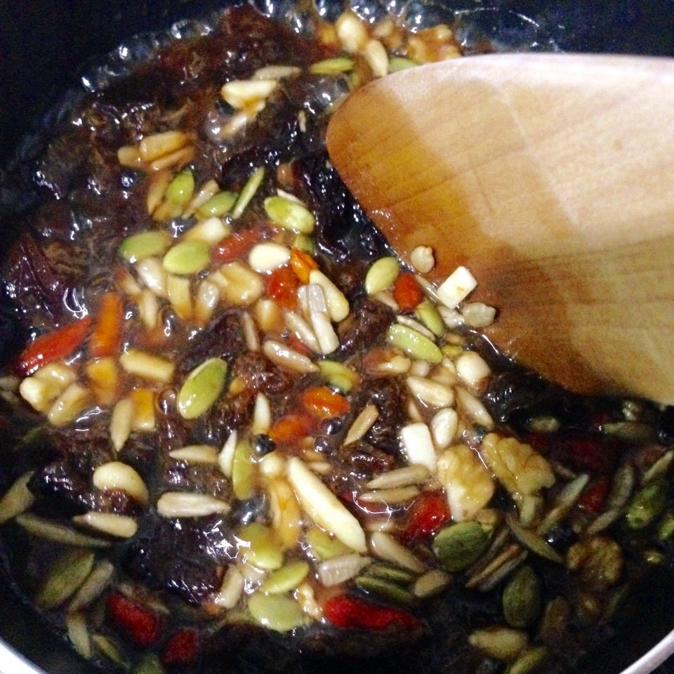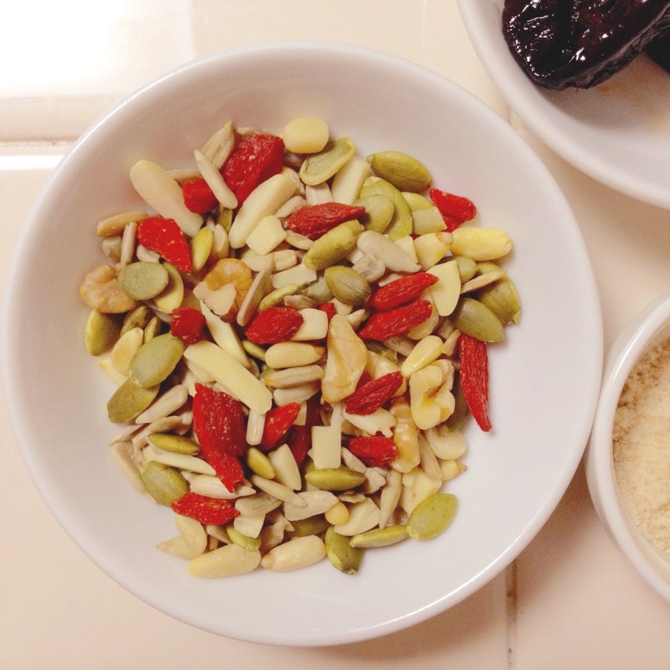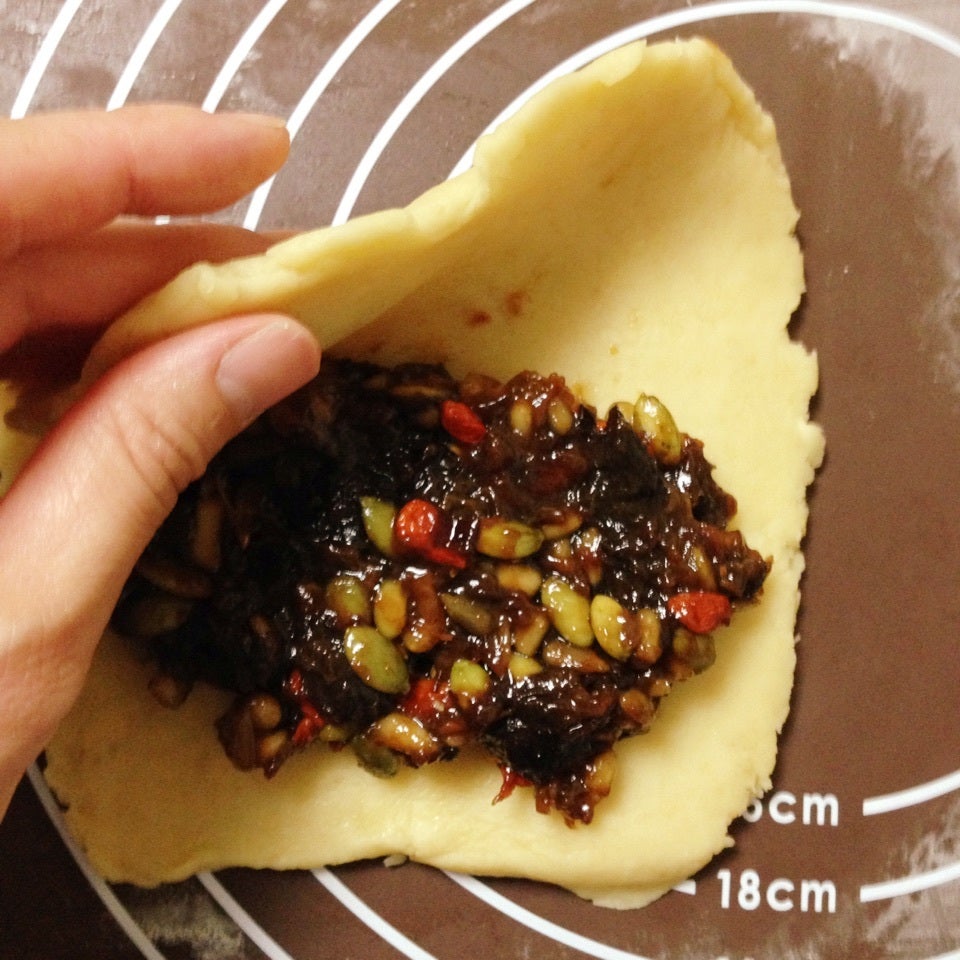 余ってた〜クコの実やかぼちゃの種・松の実・胡桃などなど入ったミックスナッツで、リトライ!溶き卵も塗ったら、生地に使った太白胡麻油も香る〜中華菓子風?!になりました![]()