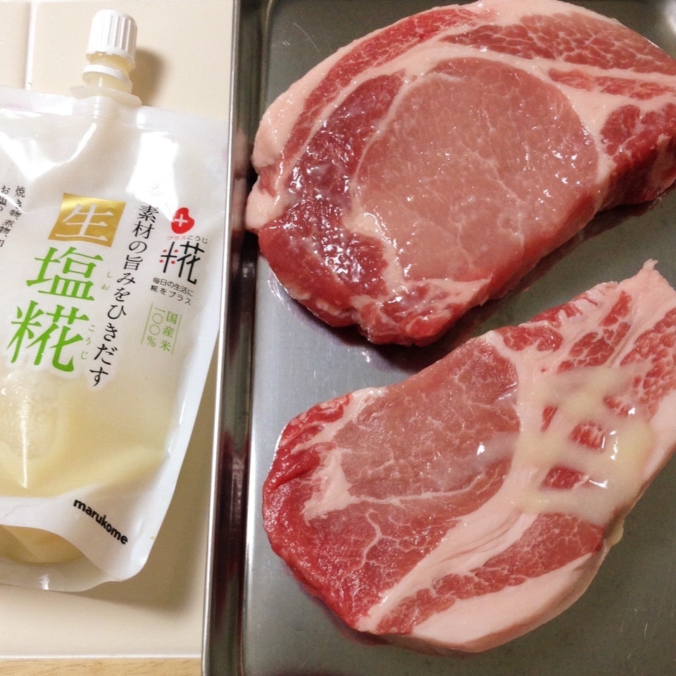 豚肉は塩麹を塗って、30分くらい冷蔵庫においておきます。