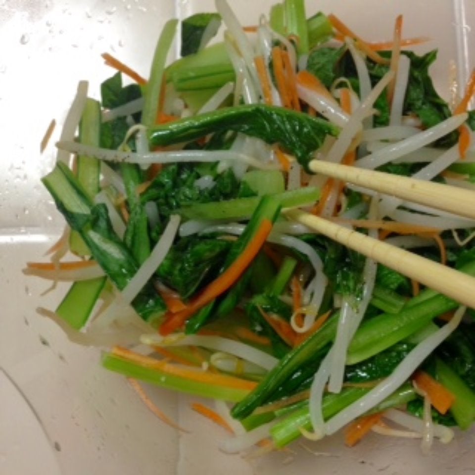 ナムルは、小松菜と人参を切ってもやしといっしょに耐熱ボウルに入れ、レンジで時間差加熱して、作ったお手軽ナムルで!簡単だけど手作りごはん度アップ⤴するかも? ୧꒰*´꒳`*꒱૭✧