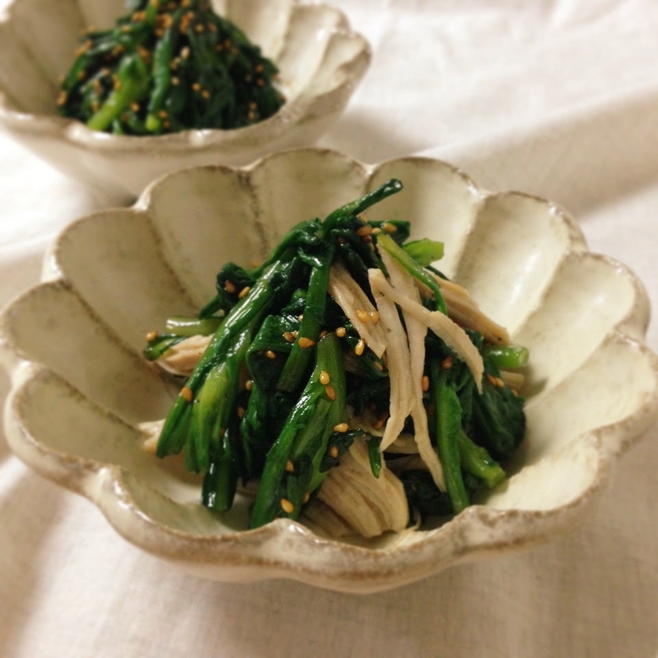 でもコレって、春菊の苦みが苦手だと食べずらいだろうなぁ…と思って、蒸し鶏と胡麻油を足してもう一品和え物を作ってみました☆