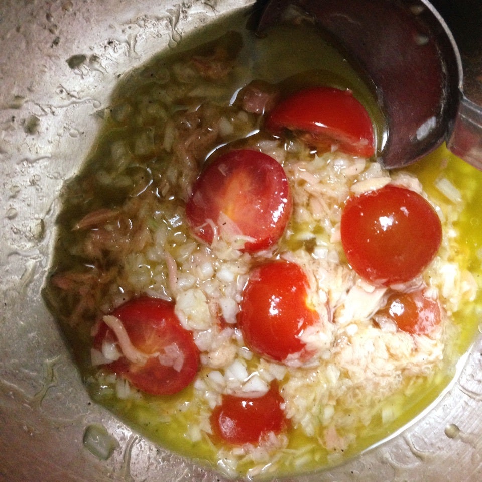 2.に玉ねぎを入れて混ぜ、ミニトマトも加えて更に混ぜ合わせます。