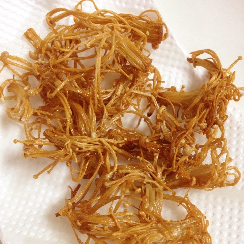 フライパンに少し多めの油をしいてえのきを入れ、中火できつね色になるまで揚げ焼きしてできあがり。