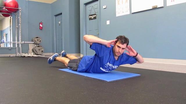 2.)左ひじを床につけたまま、右ひじを上げて上半身をひねっていき、数秒静止した後、ゆっくりと元の姿勢に戻す。