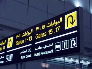途中ドバイで1時間ほど止まりました。アラブの人々の格好をした人々が空港内をたくさん歩いていることや、案内板(右の写真)にアラビア文字が書かれていること(あたりまえのこと!!)に感動してしまいました。