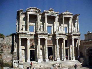エフェス都市遺跡では北入口から入り、アルカディアン通り、マーブル通りを通り、ケルスス図書館(左の写真)までをゆっくりと観光しました。その後、しばしの自由時間の後、クレデス通りを通りオデオンへ向かいました。そして、南入口から抜けて次の観光ポイントの「聖母マリアの家」(右の写真)へ向かいました。「聖母マリアの家」では、ここにあるPPT(郵便局)から手紙を出すと、マリア様のスタンプが押されるということだったので、我々もここで自分達宛にトルコのはがきを送りました。