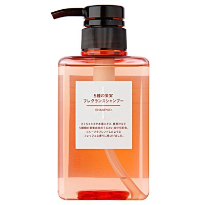 無印良品のヘアケア フレグランスシャンプー!!無印良品のフレグランスシャンプー 5種の果実・フレグランスシャンプー 400ml 税込1,500円 天然うるおい成分の5種類の果実由来成分と、美髪成分のリピジュアR(ポリクオタニウムー51)を配合。ダメージや乾燥をケアしてしっとりとまとまりのある髪に仕上げるみたいです。 さすが無印良品!!このシンプルなデザインと手頃な価格 5種の果実・フレグランスシャンプーとゆうネーミングがこれまたココロひかれる!! こっちの7種のハーブ・フレグランスシャンプー 400ml も気になる!!