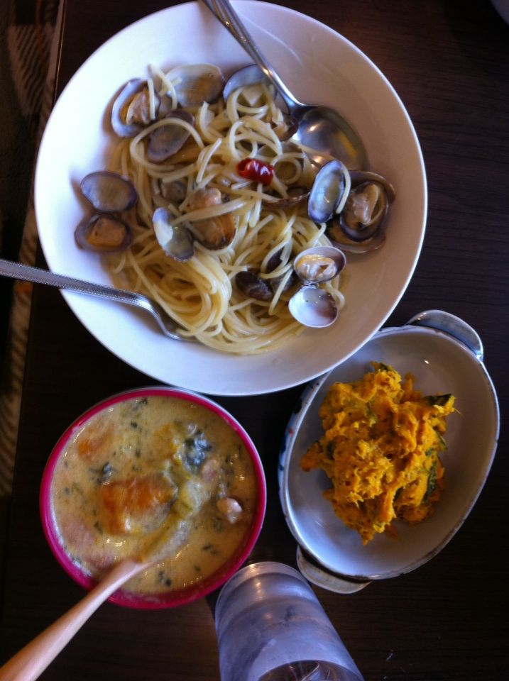 今回は具材タップリシチューとカボチャのサラダ、ボンゴレビアンコを