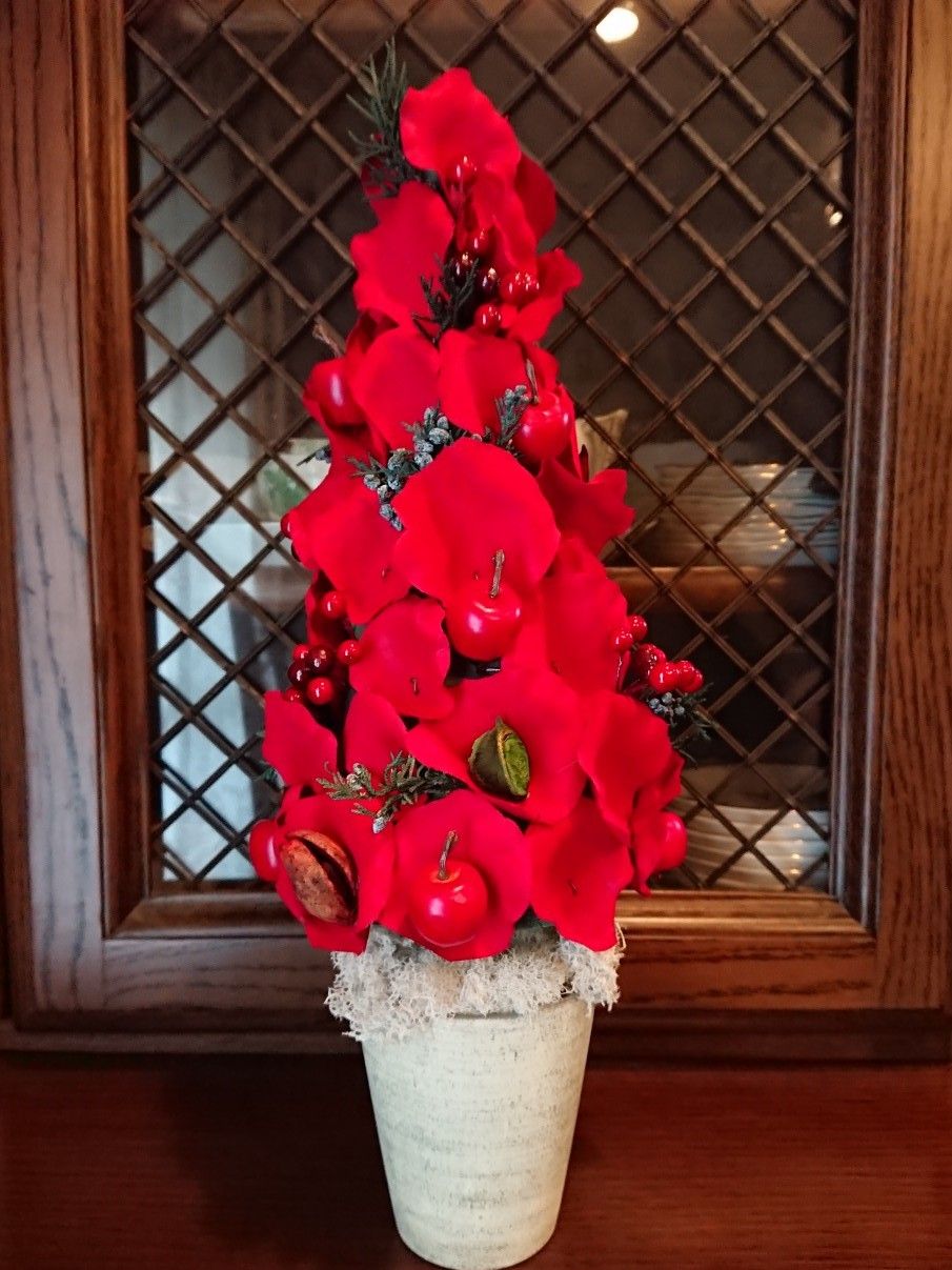 ローズペタルクリスマスツリー商店街に行くとハロウィーンを片付けたら、即クリスマス! ちょっと気が早いような…と思いますが 私も時流に乗って… お花のレッスンは「クリスマスツリー」 材料 バラの花弁(アーティフィシャル) ミニコーン(フレグランス付き) レインディアモス 姫リンゴピック ソフトストーベ etc 逆光 本日のおやつは ラムレーズンアップルパイ カットしかかったところで写真をパチリ 中心が崩れかけています(-_-;)