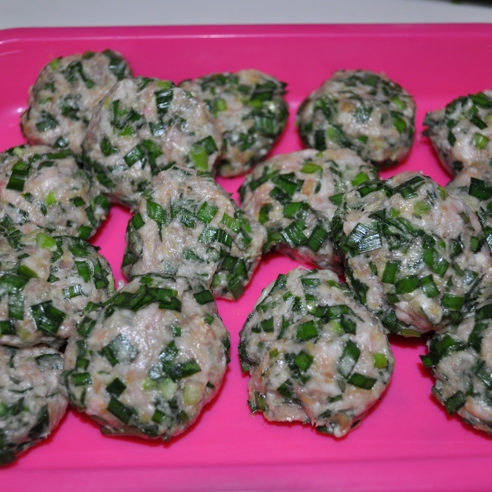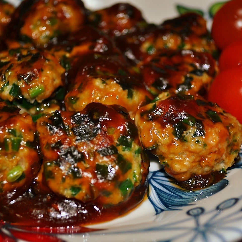 お題のにらを使って豚団子を作って甘酢あんにからめたの
