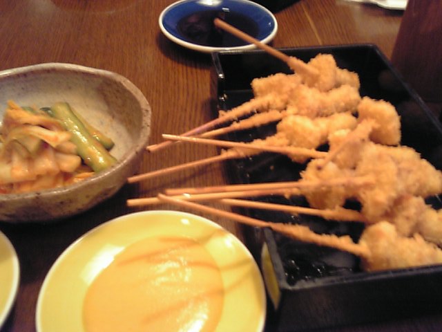 受講生のやきとり「秋吉」さんのお店に来ています。タレが四種類と大蒜、レンコンとキムチが超おいしい~!