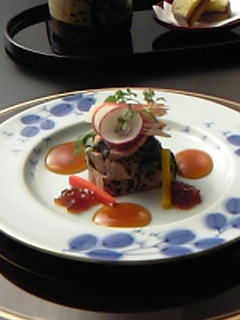 美しき滋味、和魂洋才の一皿「かつをのたたき」もプロの手にかかると、こんなにも美しく、また食欲をそそるルックスになるのです。パッと見フレンチの華やかさ。日本料理の繊細さは世界一かも・・さてお味の方は、エクシブ鳴門の「初海」でお確かめください。