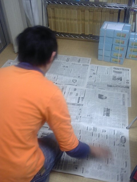今度は新聞ですか・・・さっきまで、梅ワインをくるくるしてたウキツくんが今度は床に座り込んで新聞を読んでます。この忙しいときに、またしても!と思ったら、私がうっかり忘れていた明日の「増販増客研究会」用の成功事例ボードを作成してくれるらしい。資料類は全部用意できたと思っていたのに、不覚。この新聞の上でスプレーボンドをシューシューするつもりだろうけど、お願いだから床に吹き付けないでね。今回の成功事例展示は「工務店の身内マーケティング」と「婦人生活衣料店・販売会の成功事例」です。ご参加の皆様、じっくりご覧くださいね。
