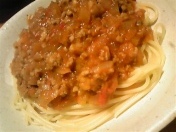 夕飯はミートソーススパです。
