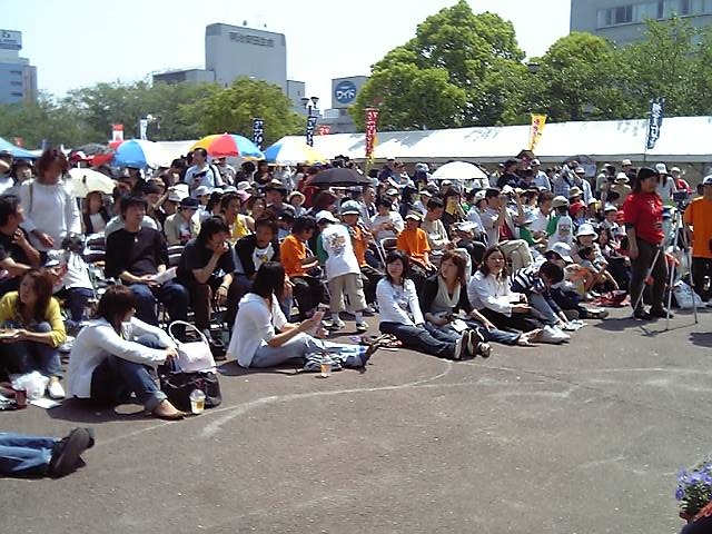 はな・はる・フェスタ2005 メインステージいよいよ午後からは、藍場浜メインステージで「アミノバリュープレゼンツ フレッシュダンス・コンテスト」が始まります。開演前からご覧の通り、若者でいっぱい!うだるような暑さの中、今か今かとお目当てのチームの出演を待っている様子。数えて3回目となるこのコンテストは四国・近畿のストリートダンサー20チーム、76名がその技とハートをバトル!今年のスポンサーも大塚製薬・アミノバリュー。ゲストステージは「Funky Navigation」。若者必見のステージに、乞うご期待!!