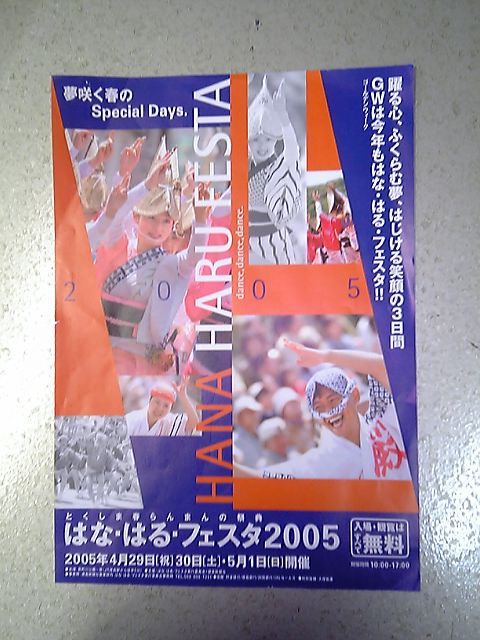 今年のゴールデン・ウィークも・・気の早い話ですが・・・今年も春らんまんの祭典「はな・はる・フェスタ2005」が開催されます。4月29.30、5月1日の3日間。阿波おどりあり、ストリートダンスあり、グルメストリートあり、ライブありのビッグイベント。企画・制作担当のココア堂は毎年今頃から大パニックに!夏の阿波おどりに次ぐお祭りだけに、すべてが大がかり。今年も新たな試み盛りだくさんで、楽しい嬉しい3DAYSにしようと思っています。GWはご家族で、徳島へGO,GO!!