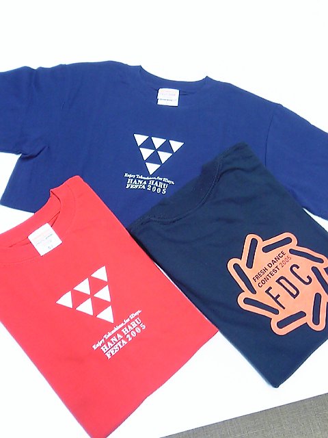はな・はる・フェスタ2005、いよいよ明日からお待たせしました!いよいよ明日から市内中心部・新町川一帯の9つの会場で3日間にわたって繰り広げられます。看板OK、ツールOK、進行OK、撮影段取りOK、新聞広告OK、設営OK、あとは当日の天気を祈るだけ!画像は私たちスタッフが身にまとうオフィシャルTシャツ3点セット。さて、明日はどれを着ようかな・・・初日のメインイベントは「アミノバリュープレゼンツ・フレッシュダンスコンテスト」。もちろん、阿波おどりもありますよ!