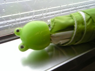 バッグに入ったままだった折り畳み傘が役に立ちそうです。可愛いケロヨンは、ジャコモさんのイベントでいただいたもの。予想外に悪天候です。