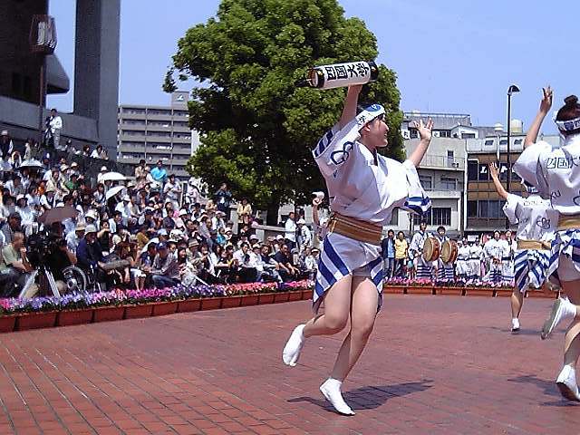 県民広場は「阿波おどりコンテスト」開幕。地元四国大学連は元気いっぱい。続いて、東京から吹鼓連の演舞が始まります!