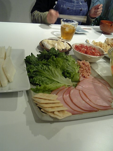 昨夜の続き・・・ではなくて昨夜美味しい手料理をご馳走になったココア堂の面々が、今夜もこんな素敵な食卓を囲むことに。というのも、今日はウキツ君の24歳のお誕生日なんで~~す!ワケあって、今夜も夜なべの彼ですが、ひととき女子スタッフにほ~ほ~されております。本日のメニューは洋風トッピングのカナッペとシーフードフルーツトマトスープです。なかなか美味しい!