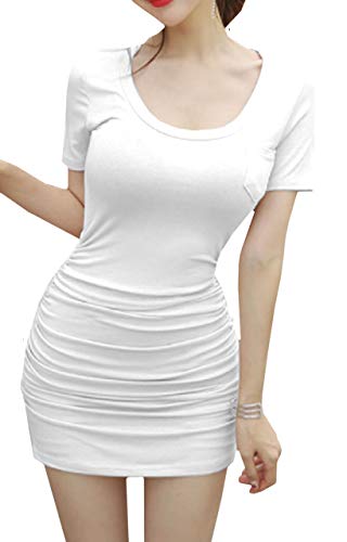 [ココアンドユカ] セクシー 胸元 半袖 タイト ミニ ワンピース かわいい T シャツ シャーリング スカート レディース ボディコン 部屋着 カジュアル ルームウェア (ホワイト, M)