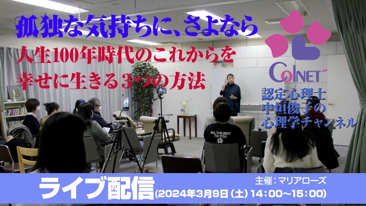 2024年3月9日(土)午後2時からライブ配信したものです。タイトルは『孤独な気持ちに、さよなら』、人生100年時代のこれからを幸せに生きる3つの方法『気もちを整理し、どう前向きに生きるか』すぐに行動できる考え方を提案。www.youtube.com