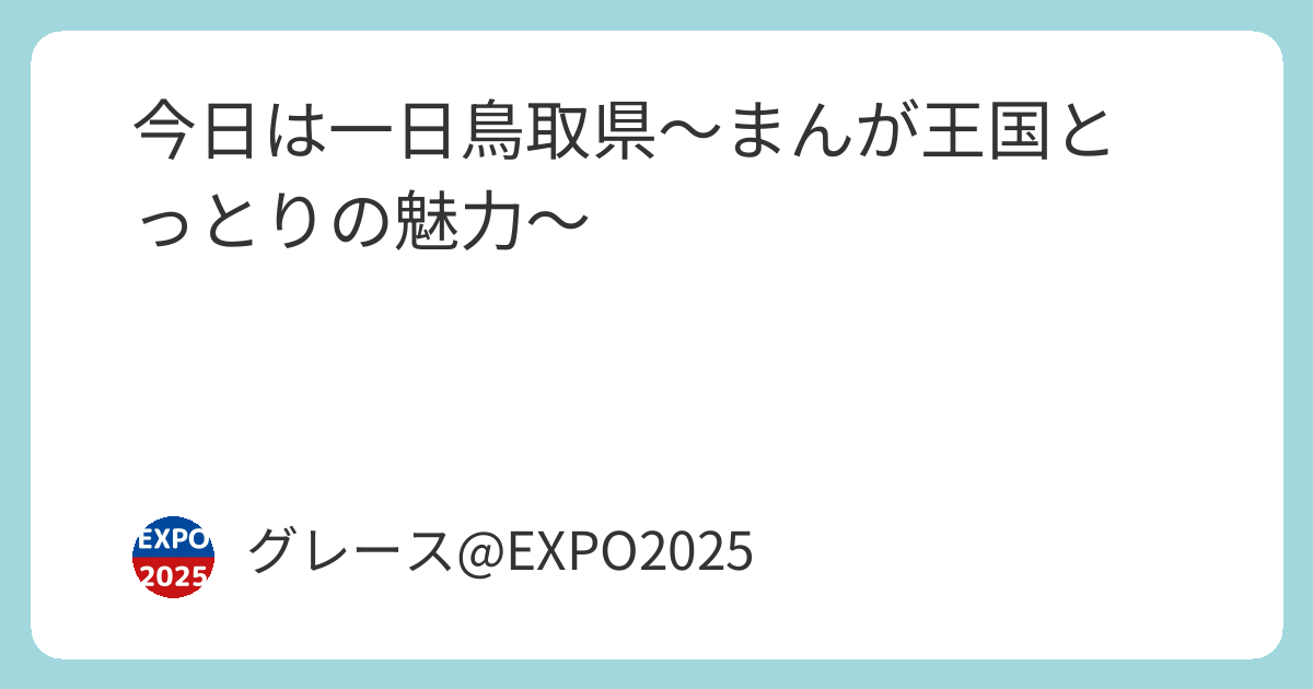 今日は一日鳥取県~まんが王国とっとりの魅力~グレース鳥取デーは鳥取県オシオシのイベントでした。一番活躍したのはあの知事かもしれません。タイトル:今日は一日鳥取県~まんが王国とっとりの魅力~場所:シャインハット(万博メイン会場・EXPOホール)日時:2025年7月1日(火)時刻:15時...www.expo2025.graceblog21.com