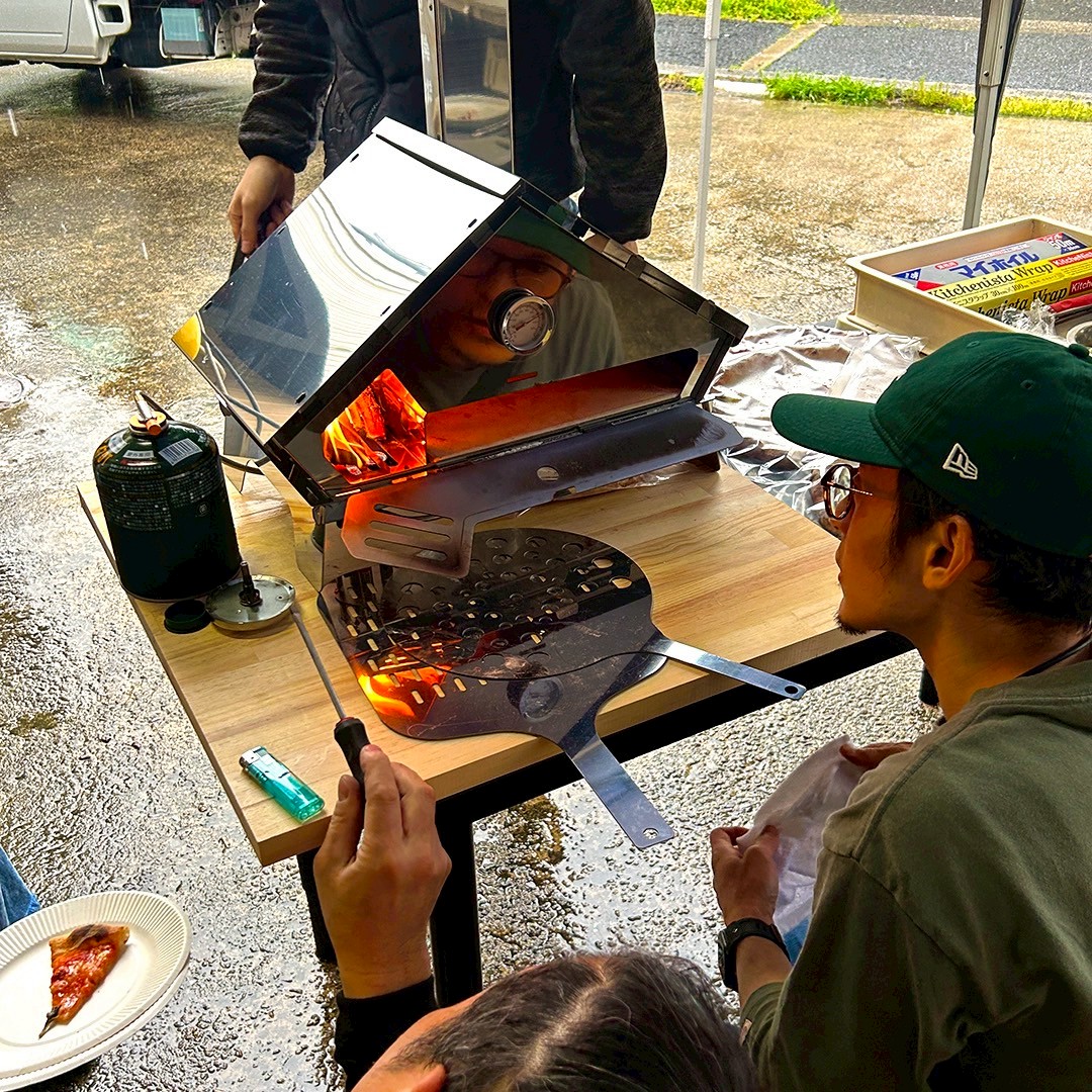 初期モデルでは熱の立ち上がりに時間がかかる点が課題となり、真喜志さんの実地テストをもとに、断熱材や空気流入構造の見直しを実施。火の回りや温度の安定性を高めるため、石窯床の厚みや材質も数回変更されました。また、設置や撤収のしやすさにもこだわり、工具不要で接続可能なフレーム設計へと進化しました。現場の声を取り入れながら改良を重ね、プロ仕様と家庭用の中間を狙ったバランスの良いモデルとして完成しました!