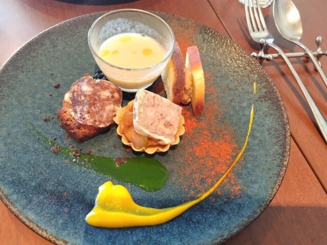 前菜盛り合わせ。塩タルトのレバーペースト乗せとか豚のリエットとか、飲まないの罪!