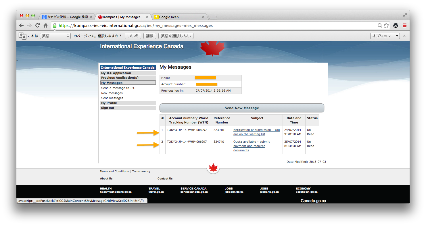 IEC申請書が受理されると、KompassアカウントのMy Messageに2通の連絡が届きます。