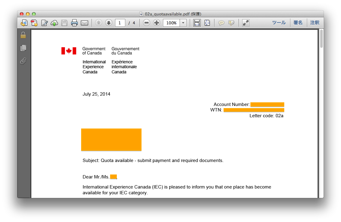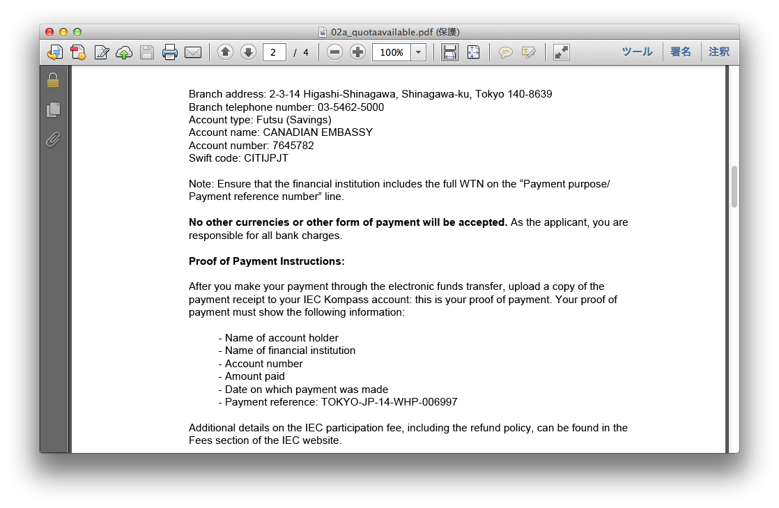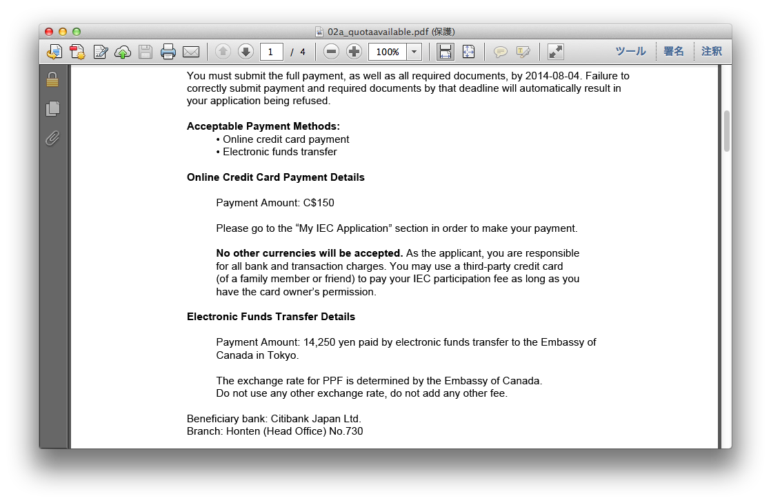 支払い方法:クレジットカード決済or在日カナダ大使館への振込必要書類:パスポートの写真つきページと英語の履歴書
