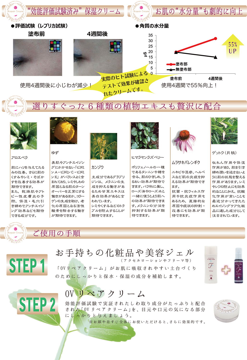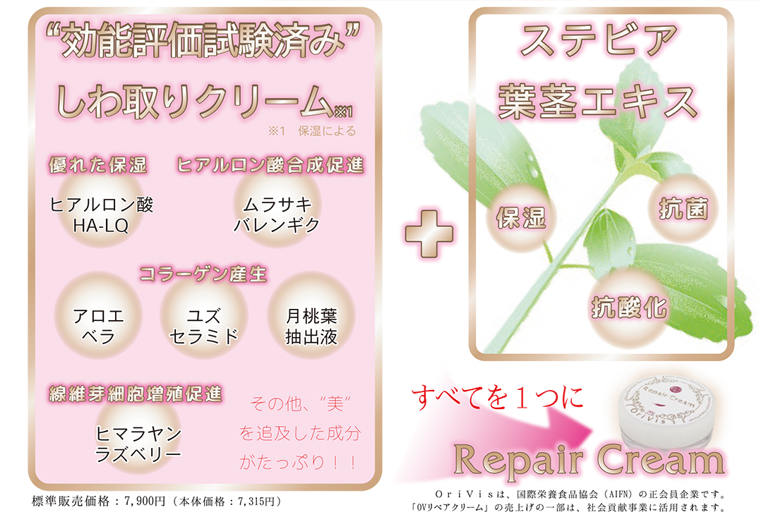 目もと 口もとに自信を取り戻す『リペアクリーム』☆ステビアワールド株式会社から ステビアワールドグループ 「オリヴィス社」製品 「 リペアクリーム 」 「まるで魔法のよう!」と絶賛!!目もと 口もと に自信を取り戻す! 「シワ取りクリームとして、効能評価試験済み」のクリームに、「当社の発酵ステビアエキスを配合」した究極の保湿クリーム ステビアの抽出液は、「保湿」に有効な化粧品原料として現在登録されています。 ステビアエキスや粉末を用いた “ステビア農法” においても、野菜や果物が通常よりも非常に “ジューシー” “みずみずしくなる” といった作物の保水力を高める効果や、収穫物を美味しくいただける期間が長くなる“日持ち効果” が確認されています。 そんなステビアを用いたリペアクリーム とてもみずみずしい感触でつるっとした手触りです 保湿力は高いのにベタつかないので気持ちよく使えます 抗酸化力が緑茶の7倍と言われるステビア入りだから、 保湿以外にもアンチエイジング効果が期待できそう ステビアワールドグループファンサイト参加中 ステビアワールド株式会社 オリヴィス株式会社