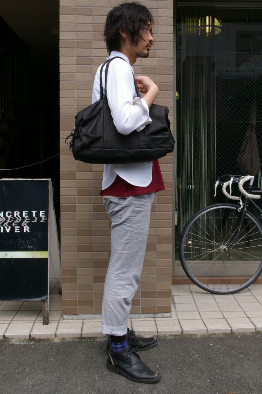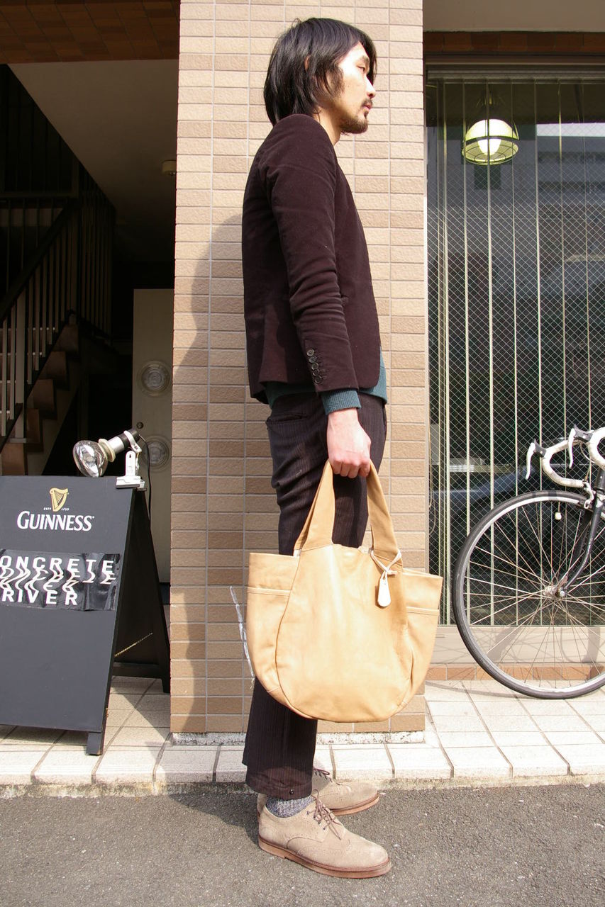 ”RENには中性的な雰囲気で展開する 『FUKURO フクロ』 というラインがあります。 古くからあるシンプルな袋や使い捨ての袋などに注目し、素材のくったりとした柔らかな風合いがそのままいきるような、形やサイズにこだわり作られています。 素材にはオリジナルレザー『BABE/ベアー』を使用、軽くてシンプルなバッグにするために、出来るだけ金具を使わずシンプルに仕上げました。