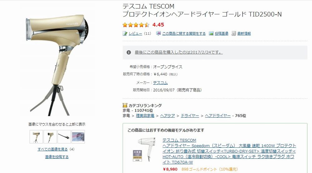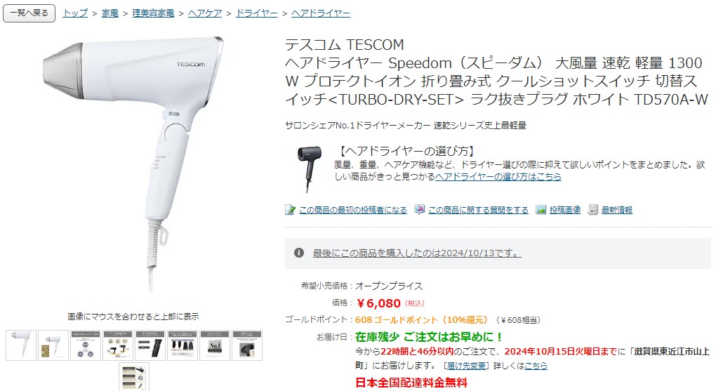 2024年10月13日(日)・・・ドライヤーが壊れました ドライヤーが、とうとう故障してしまいました。 7年7か月、ご苦労さまでした。 大急ぎで同じメーカーのドライヤーを、ヨドバシ.comさんに注文しました。