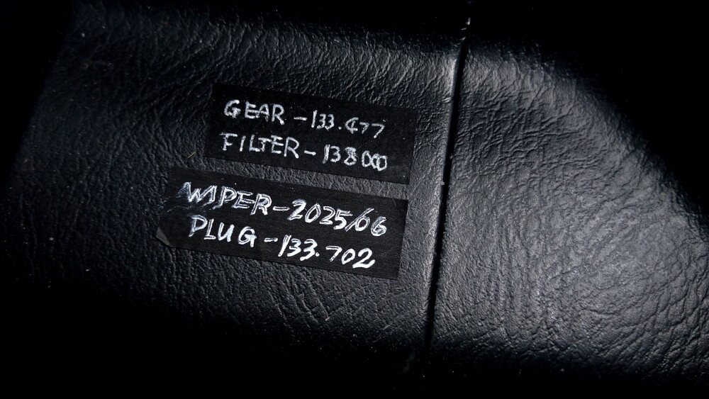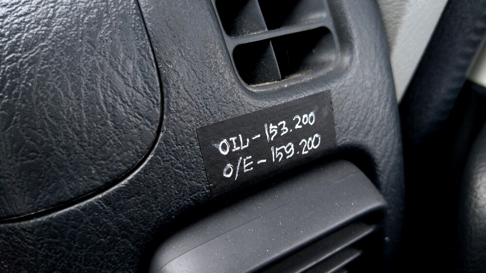 ダイモテープから黒マスキングテープに変更した、オイル等の交換ステッカー。