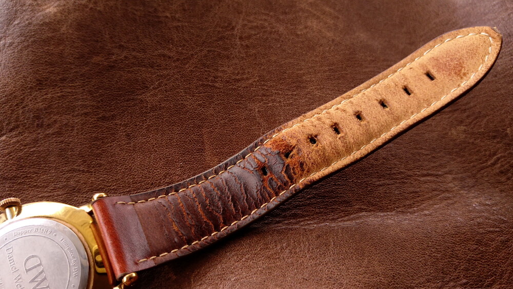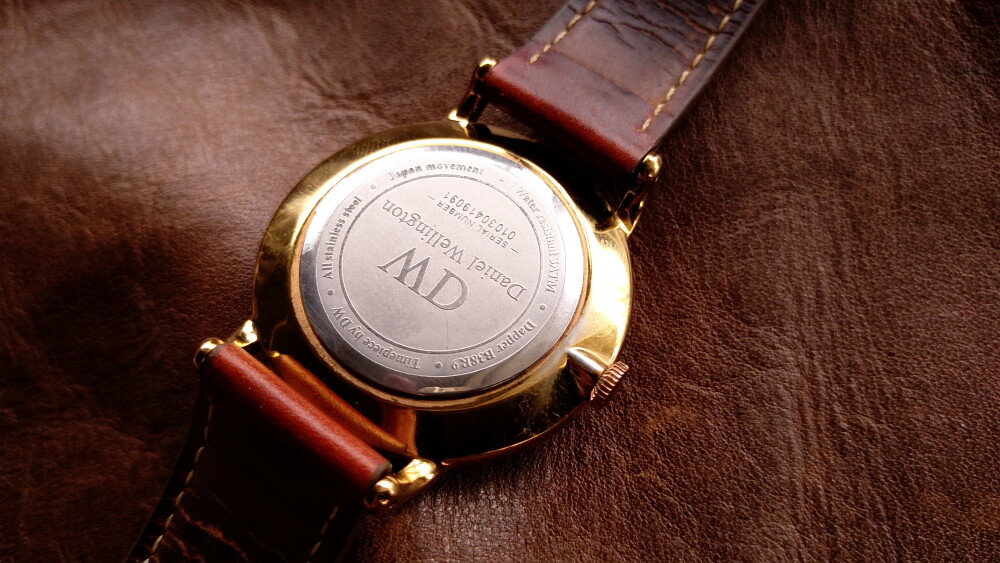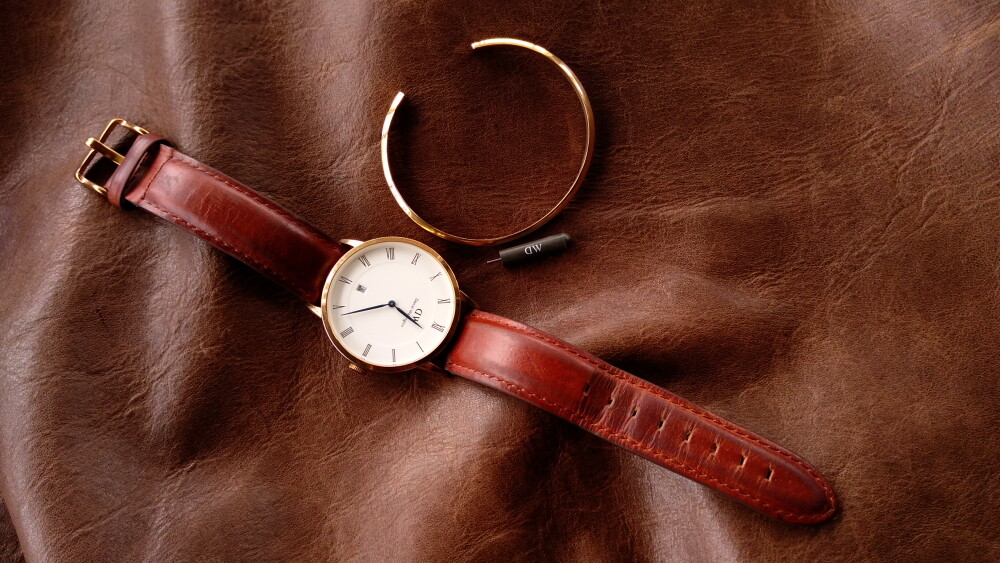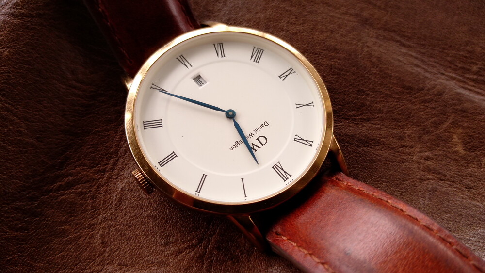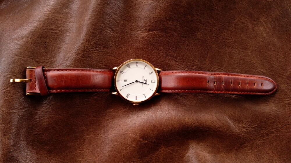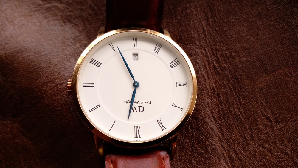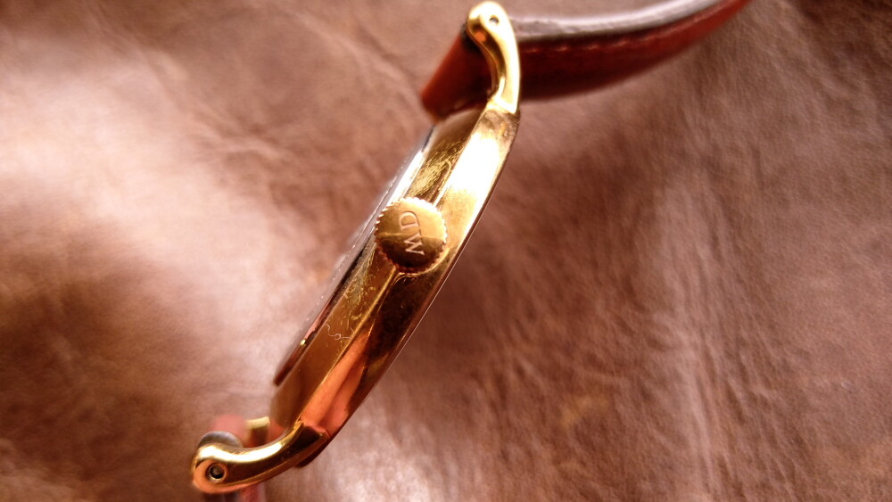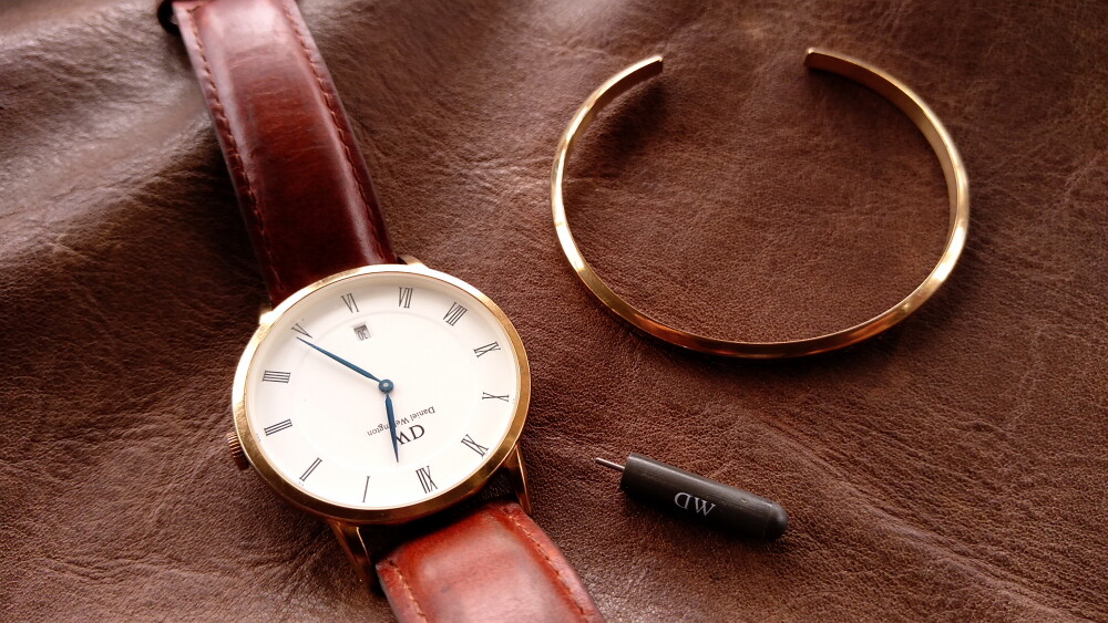2025年06月11日(水)・・・ダニエルウェリントン(38㎜、白&金&青針)、到着 10本目のダニエルウェリントンが、到着しました。 箱等はありませんが、バングルと純正バネ棒外し付です。 状態は、傷や汚れありです。 革ベルト以外は、じゅうぶん綺麗でした。