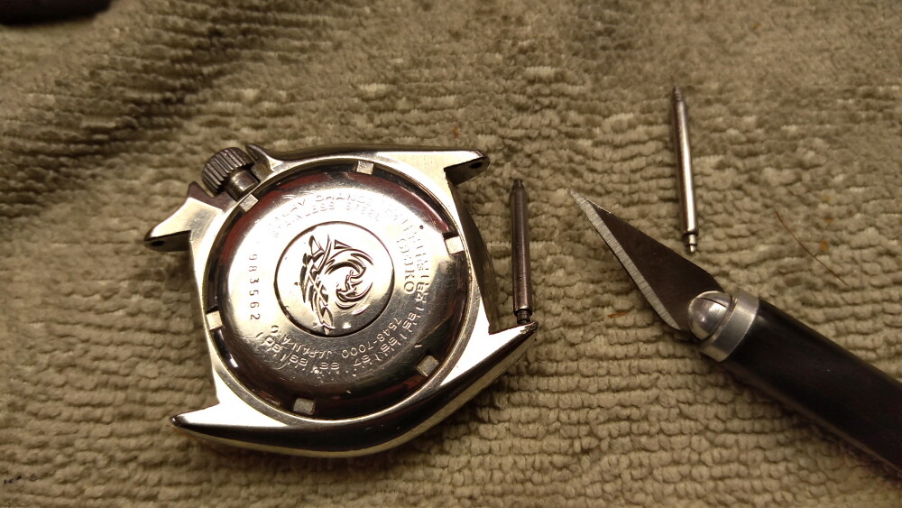 それでもバネ棒外しでは無理だったので、デザインナイフで外しました。