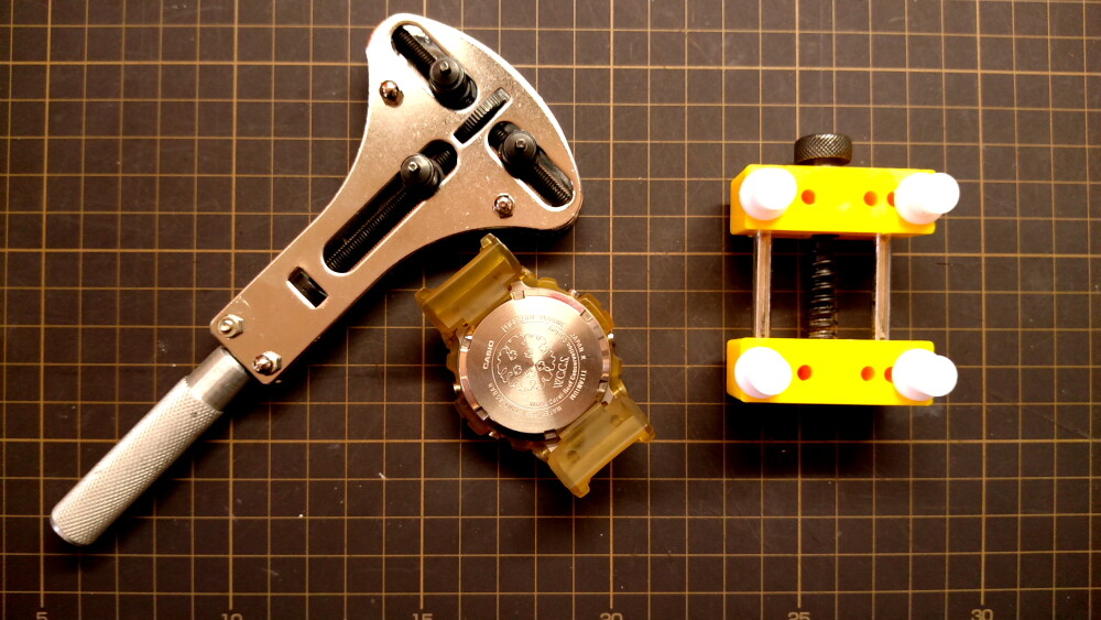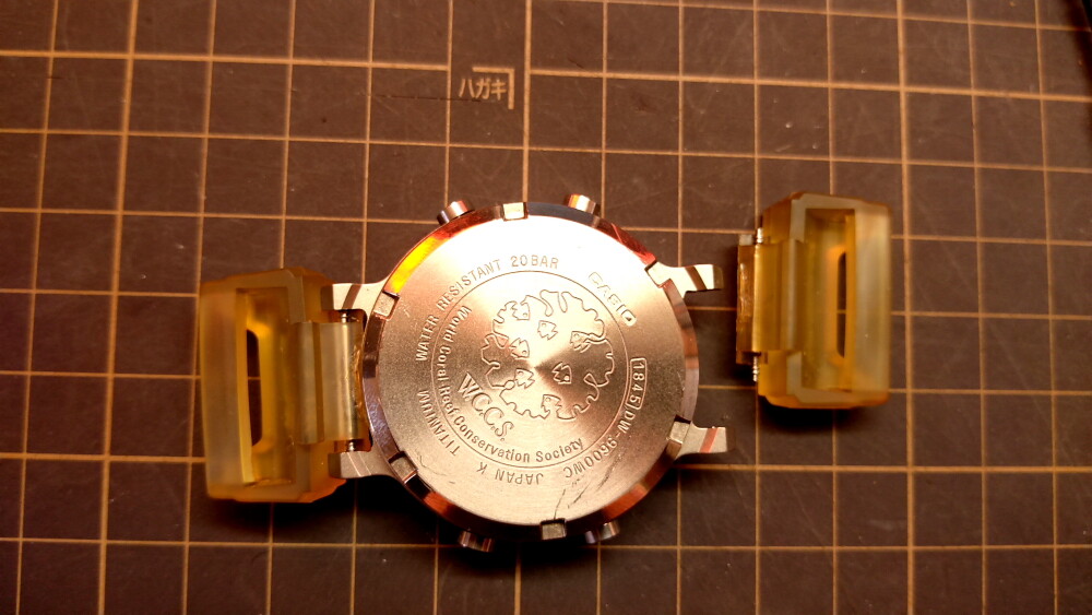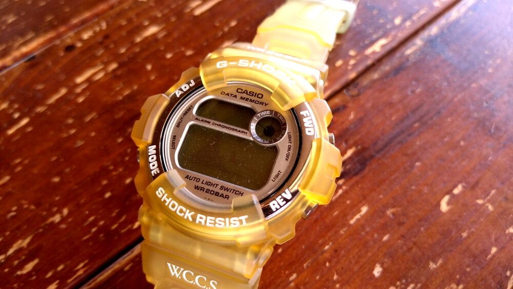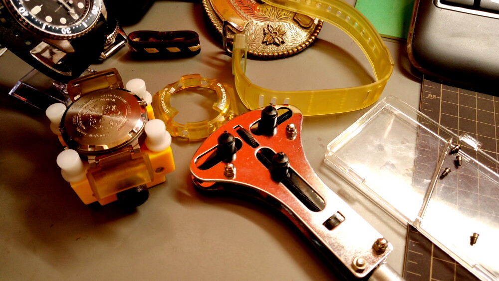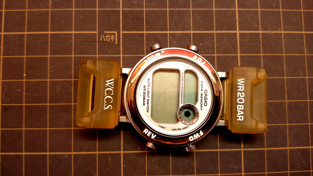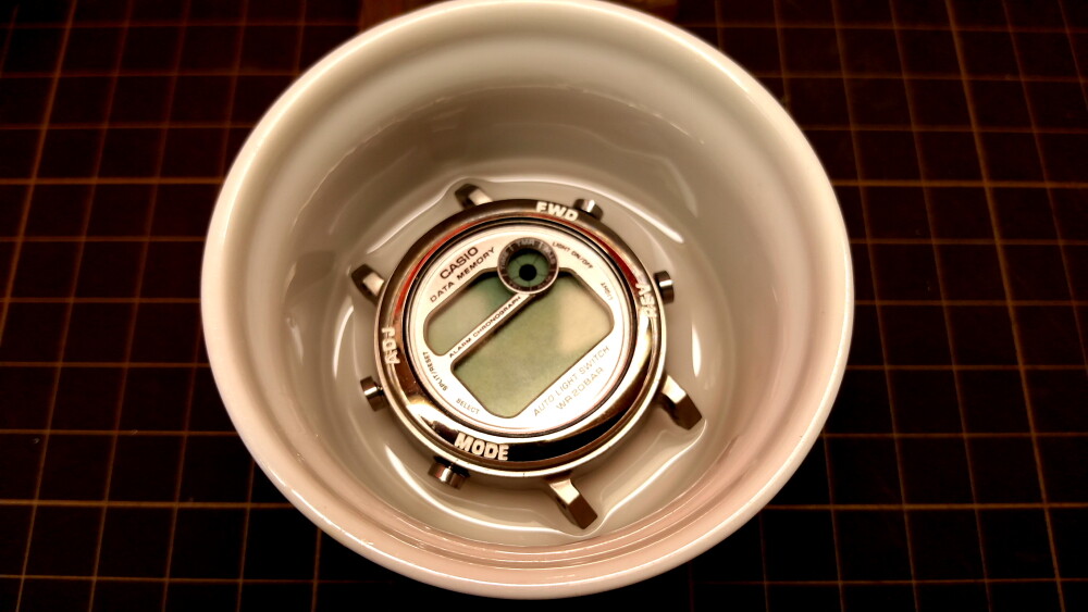 2025年09月02日(火)・・・Gショック DW-9600WC、発見 Gショック DW-9600WCを、スタンドで見つけました。 もちろん、電池は切れています。 裏蓋を開けて、電池の番号を調べようとしたのですが・・・ 固くて開かないので、ベゼルも外しました。 ベゼルを留めているネジも、CRC-556を吹いてやっと外しました。 外せるものは全部外して、再度挑戦しましたがやはり開きません。 ベンジン代わりのガソリンに一晩漬けてみます。
