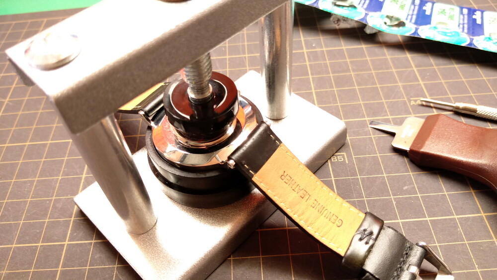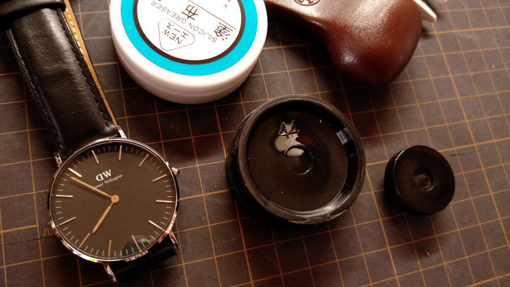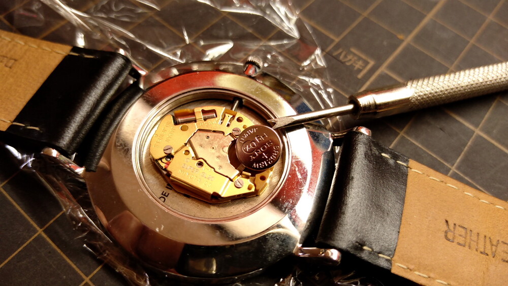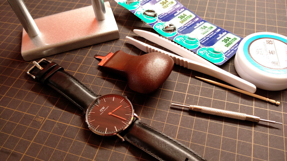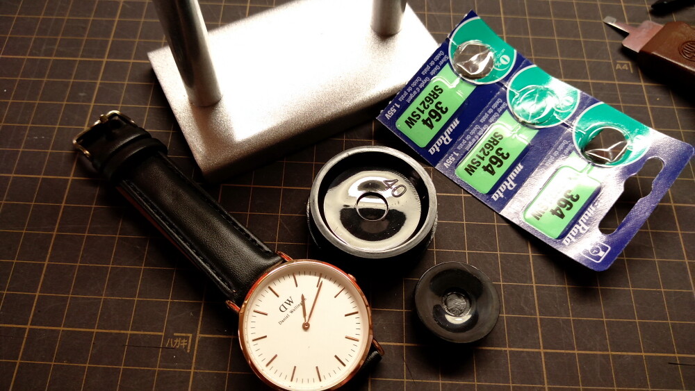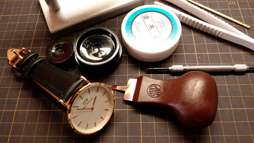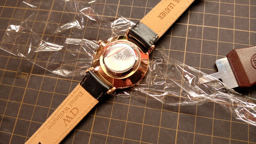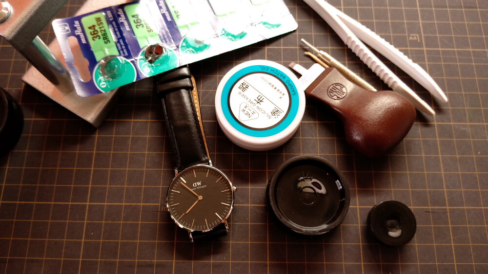 2025年06月12日(木)・・・ダニエルウェリントン、電池交換10本目(新品36㎜、黒&銀) 本日6本目の電池交換は、新品同様の黒&銀36㎜です。 裏蓋をこじ開けます。 裏蓋パッキンをグリスアップ。 電池を交換します。 裏蓋しめ器で、しっかりと閉めます。 今日の電池交換は、これで終了します。