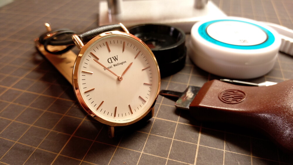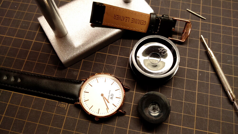 2025年06月12日(木)・・・ダニエルウェリントン、電池交換9本目(新品40㎜、白&金) 本日5本目の電池交換は、1番最初に購入した白&銀の40㎜。 裏蓋をこじ開けます。 パッキンをグリスアップ。 電池を交換。 裏蓋しめ器で、しっかりはめ込みます。 電池交換、終了です。