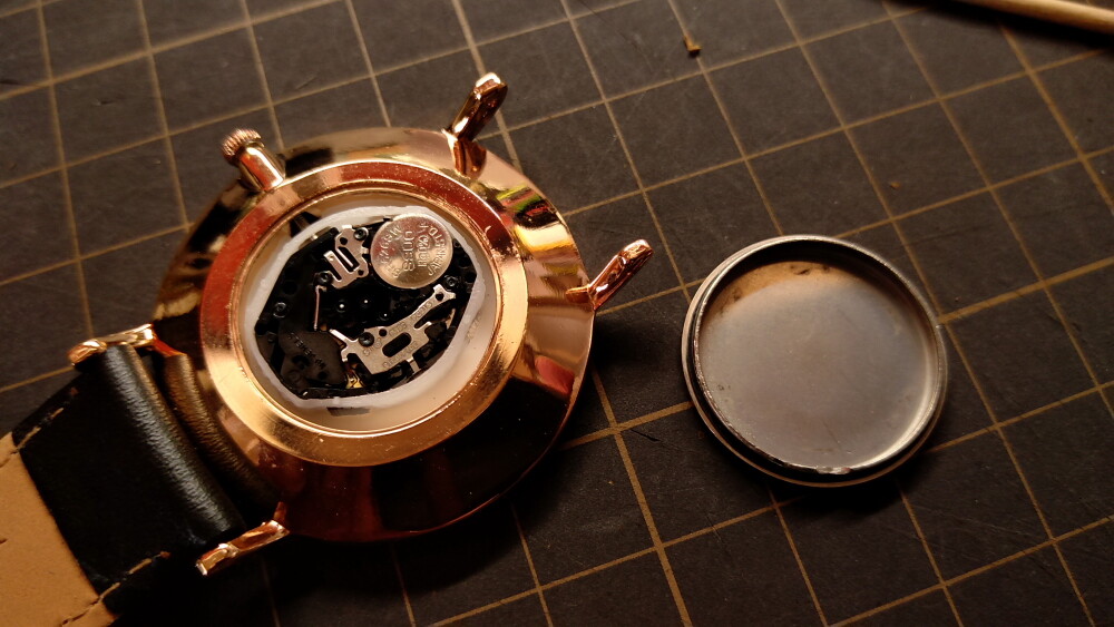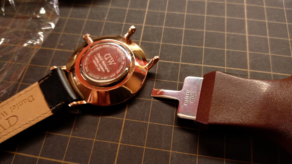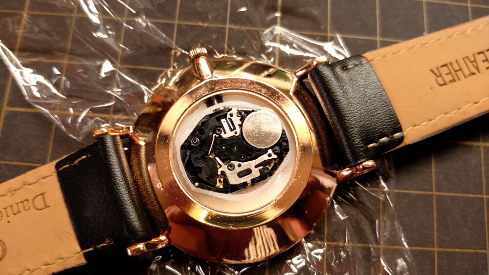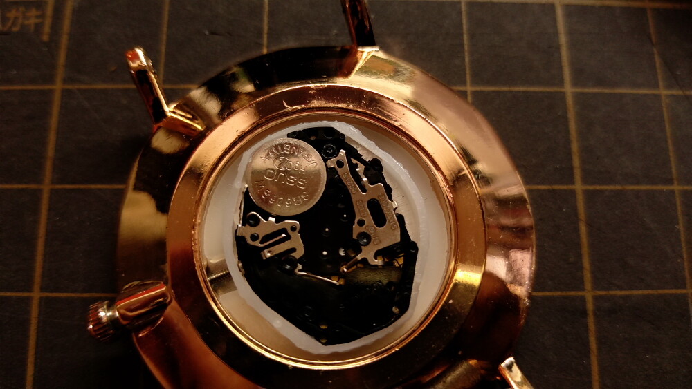 2025年06月12日(木)・・・ダニエルウェリントン、電池交換8本目(新品36㎜、白&金) 本日4本目の電池交換は、革ベルトの色が気に入って購入した36㎜の白&金モデル。 同タイプをすでに3本購入したあとだったので購入を悩んだ1本でしたが、在庫の2本が コピーと判明した今となっては貴重な存在になりました。 もちろん、まず最初に確認したのはこじ開け用のこの隙間の位置。 ちゃんと、リューズの対角線の位置でした ムーブメントも、裏蓋の刻印も大丈夫でした。 電池交換&パッキングリスアップして、裏蓋を元に戻して完成です。