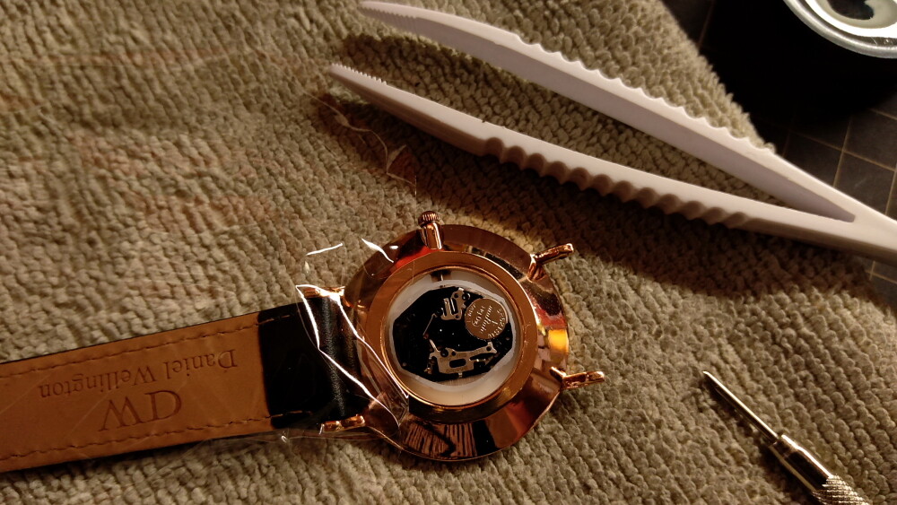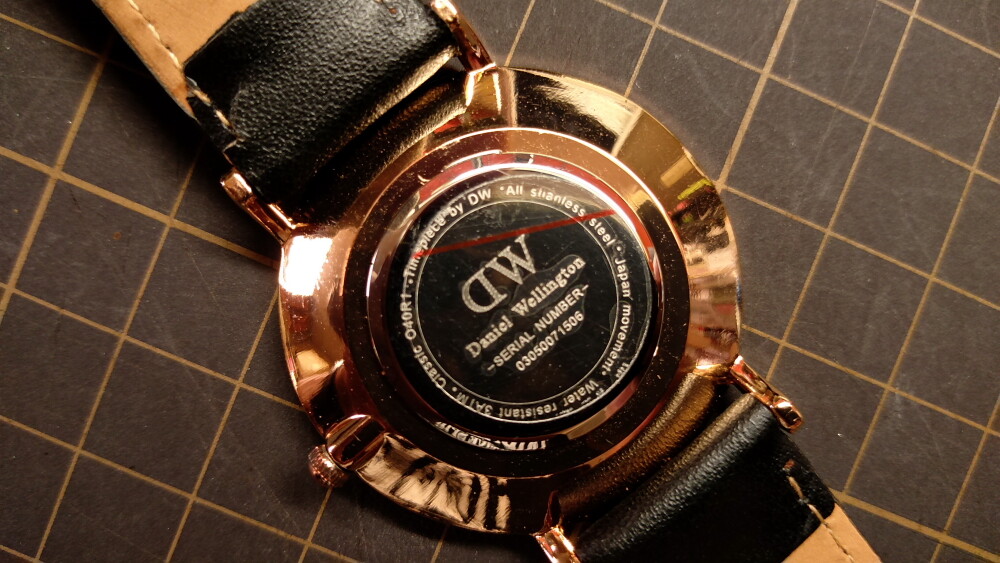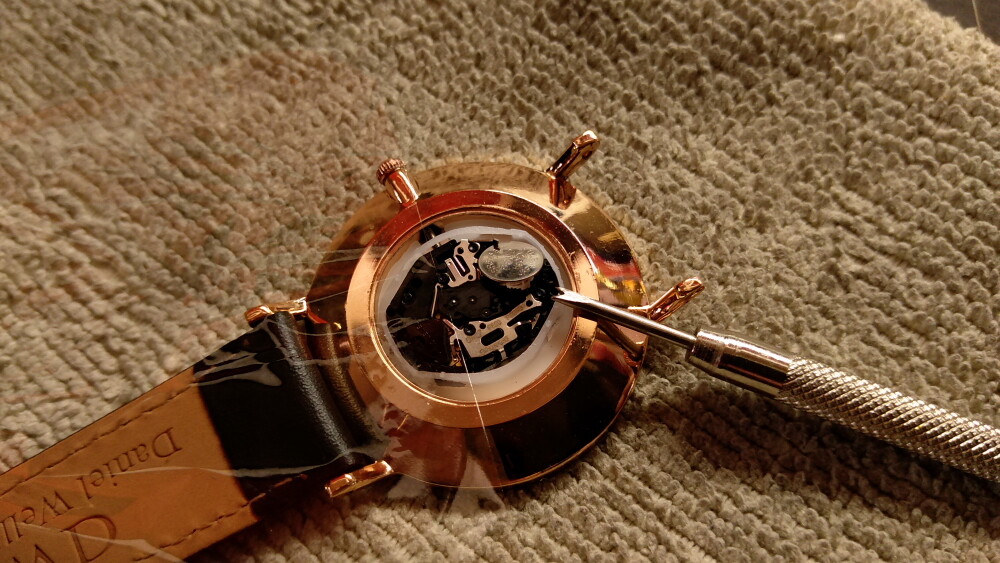 2025年06月12日(木)・・・ダニエルウェリントン、電池交換6本目でコピー発見 今日の2本目の電池交換は、新品未使用の白&金36㎜DWです。 裏蓋を丁寧に開けたのですが、ここで少し気になることを発見。 今までの6本はこじ開けを差し込む隙間の位置が同じだったのに、今回は違います。 なんか、嫌な予感がしました。 予感的中、ムーブメントも違いました。 裏蓋の内側にも、本物にはあるはずのmade in china の刻印がありません。 どうやらコピー品に間違いなさそうです。 7本目の電池交換でとうとう出会ったコピーですが、これもDWのコレクションとして は貴重かもしれません。