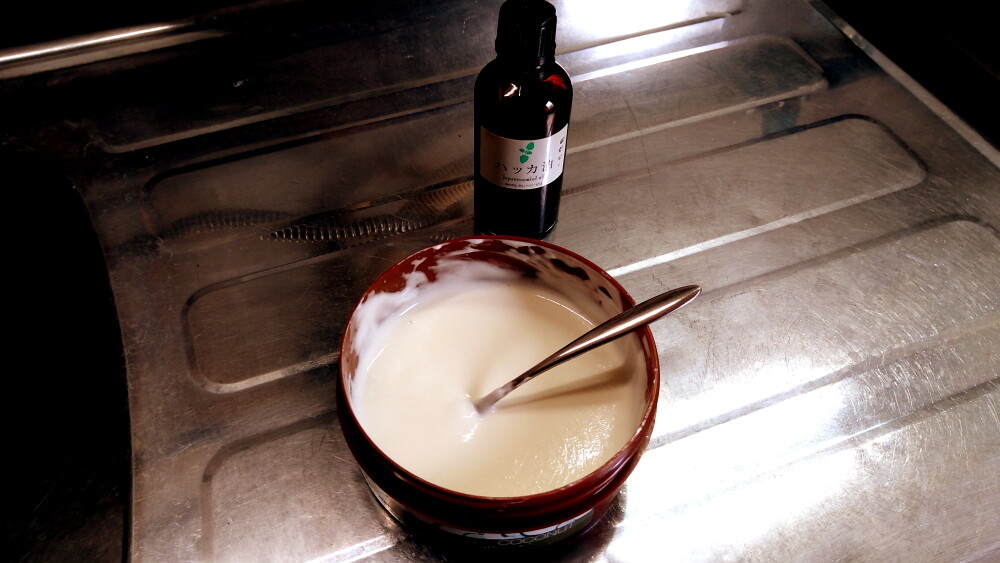 湯煎でハッカ油が揮発しているので、4滴ほどハッカ油を加えます。