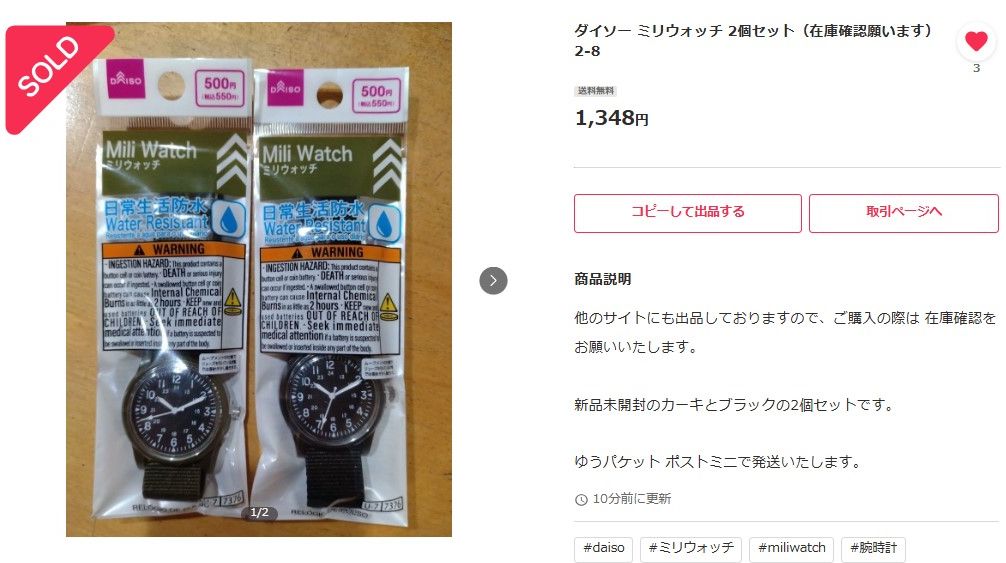2025年12月23日(火)・・・ミリウォッチ、購入 ダイソーで久しぶりにミリウォッチを見かけたので買ってみました。 よく見るとマイナーチェンジしたようで、雰囲気が変わっていました。 本当は日本製ムーブメントの初代?が欲しかったのですが、プレミアが付き始めて いたので、見た目がそっくりな3代目をメルカリで追加購入しました。
