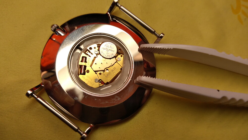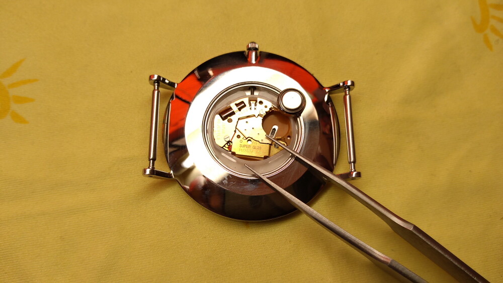 プラスチックピンセットで、慎重に新しい電池をセットします。