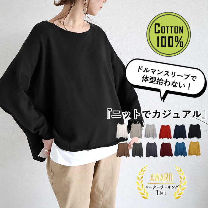 【数量限定!2653円!クーポンで〜3/17 12:59迄!】 ゆったりワンサイズ♪【綿100%ニット×全10カラー】【楽天1位】ニット レディース ドルマン 体型カバー カットソー ゆったり 無地 薄手ニット 重ね着 トップス 長袖 おしゃれ[郵2]^t1065^ 楽天市場
