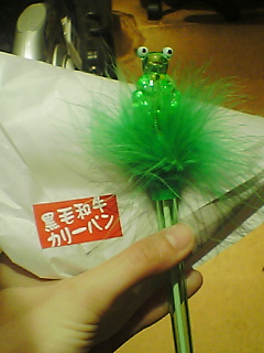行商お店の偉い人からロイヤルホストのカレーパンいただきました。黒毛和牛……さすがロイホ。カレーパン久しぶりだなぁ。お店には時々行商の人が来る。CMしてないコラーゲン入りドリンク、栄養ドリンクなどなど。「困ってるんです」と疲れきった人が売りに来るので買っちゃうらしい。今日はボールペン……。蛍光色で鳥の羽付いてて書く時ピカピカと光ります。黄色にはヒヨコ、赤にはハート、青にはイルカがついてます。イルカは目付きがすごく悪い不良イルカです。私はカエルをもらいました~。三本千円!!高い……。